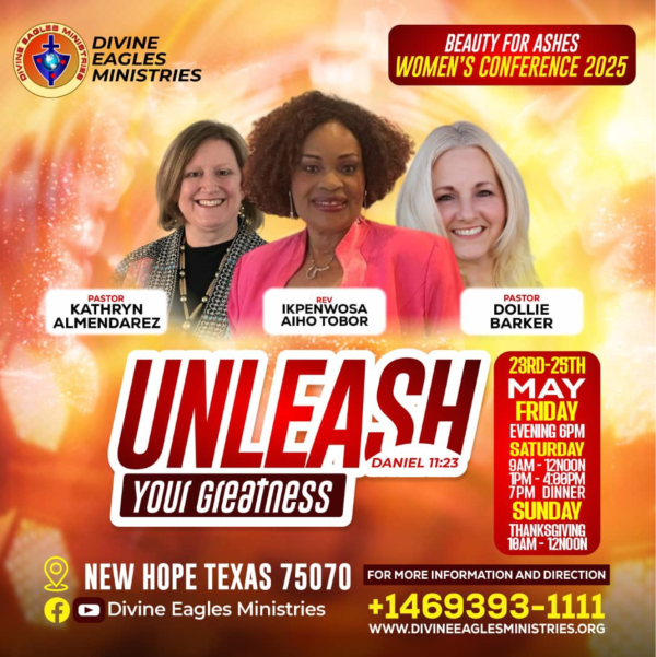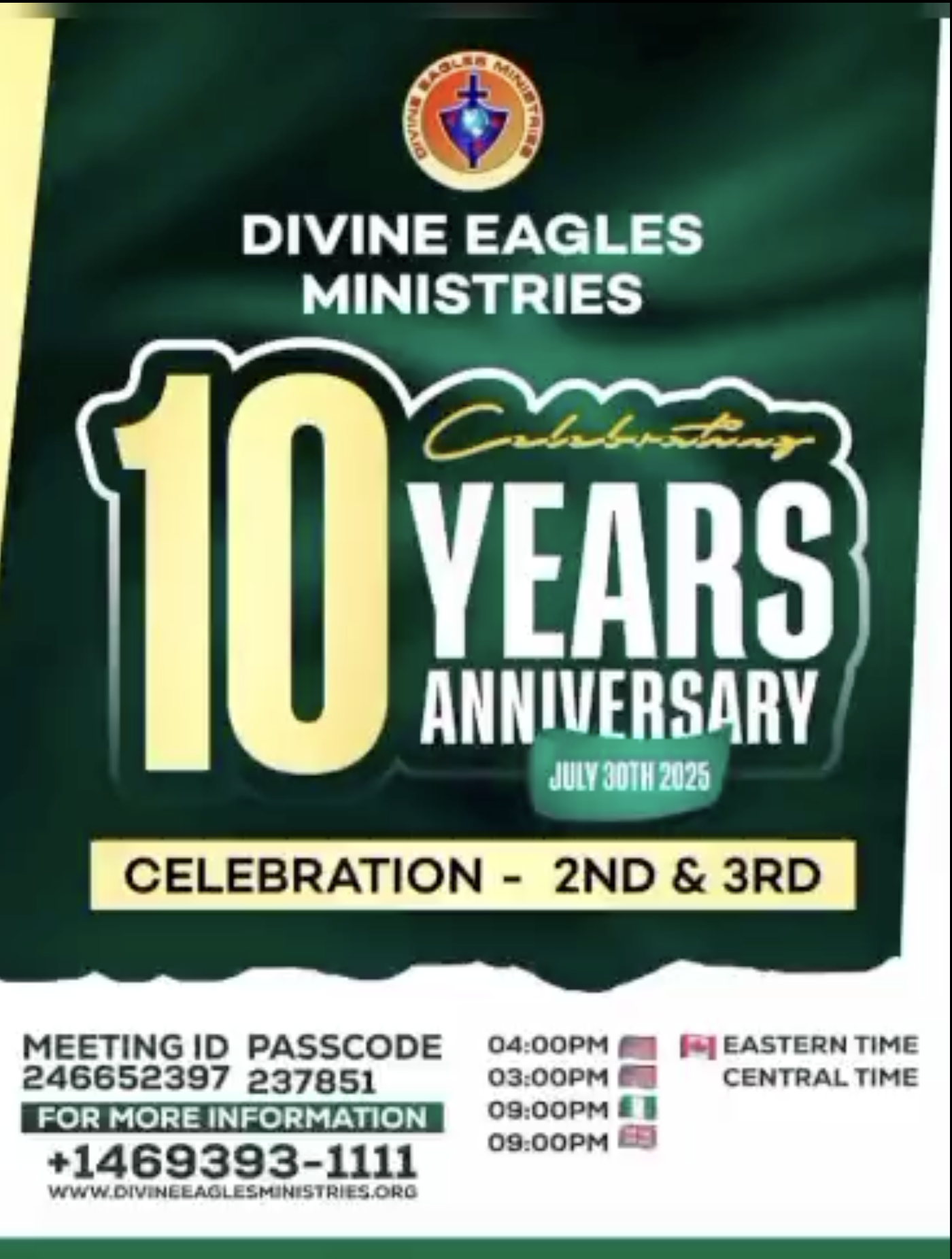 Main Date: July 30, 2025 Service Times: Eastern Time: 4:00 PM & 9:00 PM Central Time: 3:00 PM & 8:00 PM Join Us on Zoom:Meeting ID: 246 652 397Passcode: 237851 Visit: www.divineeaglesministries.orgFor More Information: +1 (469) 393-1111 Come celebrate 10 years of God’s faithfulness with us—expect powerful worship, inspiring testimonies, and a fresh word from […]